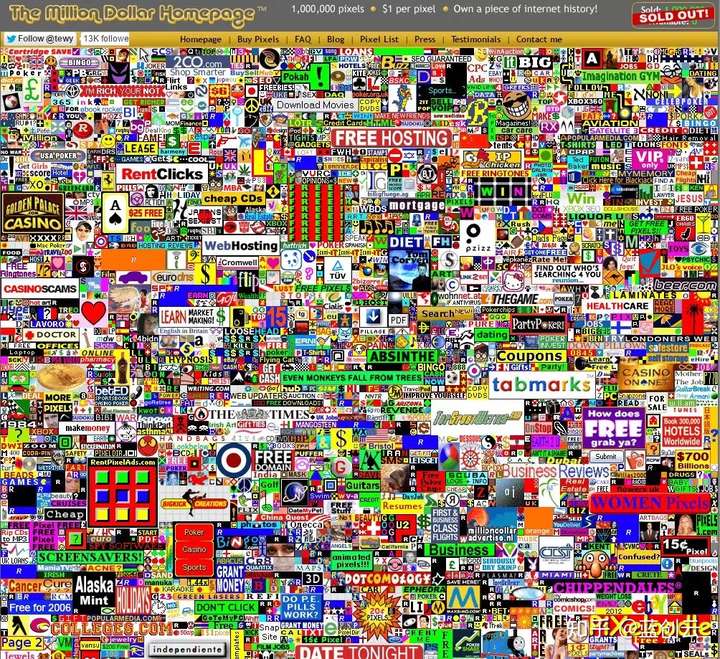 百万格子网站由一个年轻的美国学生亚历克斯·图创办。他在自己的 网站首页划分了1万个格子出售,每个格子的价格是100美元。买家可以在 自己购买的格子中随意放置任何东西,包括特意设计的图片链接、个人网 站logo,公益广告甚至是个人名字等。在短短的几个月之内,所有格子都 卖了出去,亚历克斯·图轻而易举地赚取了10万美元。
