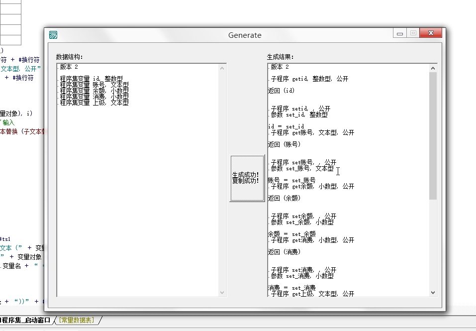 其实我还自己做了一些其他的搬砖工具,比如一键生成 解析json到易语言 数据类型/类 的代码,自动替换组件名称的代码,有时间了一起做成易语言助手的插件发布一下。(2025年留言:这就是当年的一个flag,然后就没有然后了,不过过了没多久有易友参考我这个代码封装了一个插件,再后来易语言的美化IDE和易语言插件都支持了)